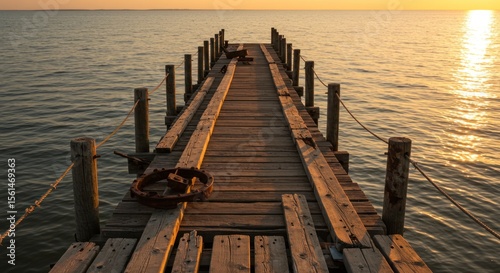Obraz premium Dilapidated wooden pier stretches toward a shimmering sunset on a tranquil...