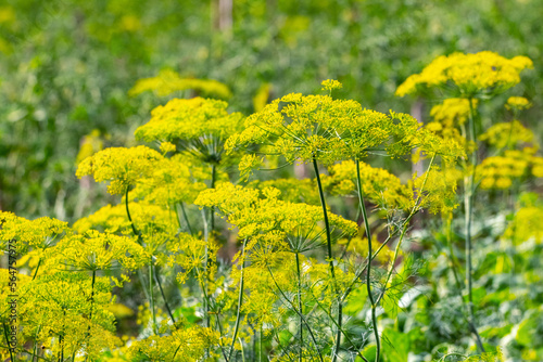 Obraz premium Dill on the beds. Dill inflorescence in the field, growing dill