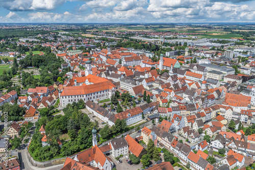 © ARochau, Obraz premium Dillingen im bayerisch-schwäbischen Donautal an einem sonnigen Sommertag aus der Vogelperspektive