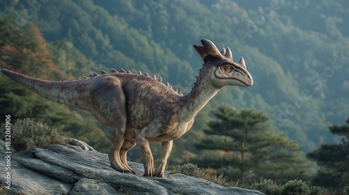 © vlntn, Obraz premium Dilophosaurus on Rocky Forested Ridge at Sunrise