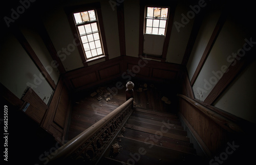 © NS Frames, Obraz premium Dim spiral staircase with carved bannister in abandoned building.