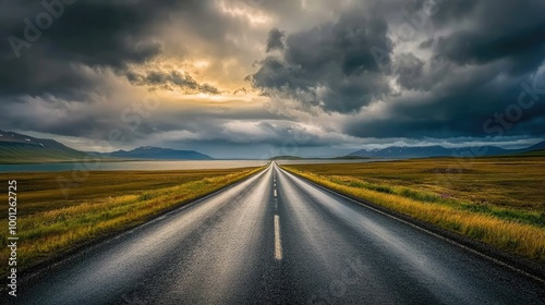 Naklejka premium Diminishing perspective of an empty highway cutting through the scenic Icelandic landscape, bordered by a still lake and dramatic sky.