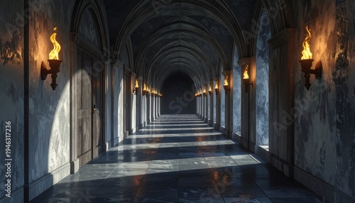 © stock, Fototapeta premium Dimly Lit Arched Corridor with Sconces.