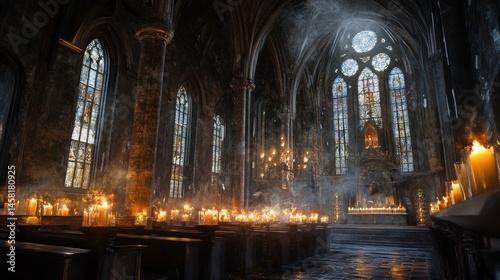 Fototapeta premium Dimly lit church interior with candles and stained glass windows