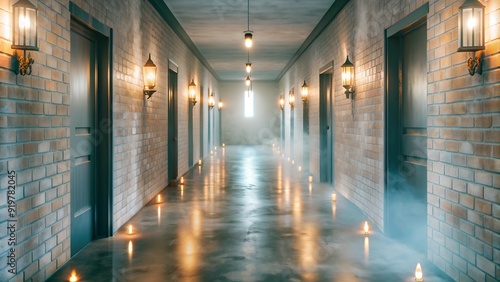 Fototapeta premium Dimly Lit Corridor with Lanterns and Candles, Mysterious Atmosphere