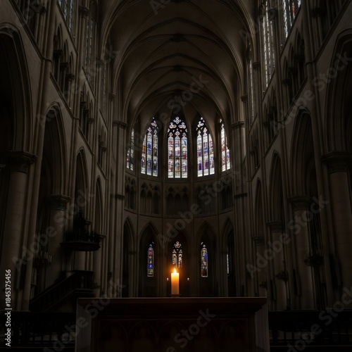 © Muhammad Awais, Fototapeta premium Dimly Lit Gothic Cathedral Interior with Single Candle on Altar and Stained Glass Windows