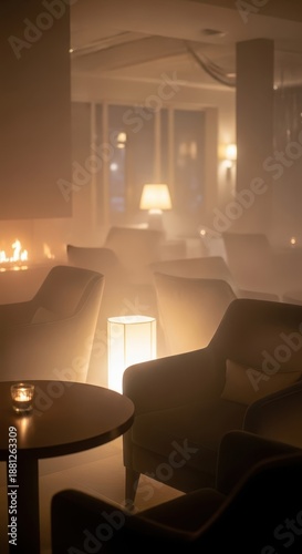 © Ariestia, Naklejka premium Dimly lit luxurious interior space creates an intimate and smoky atmosphere.