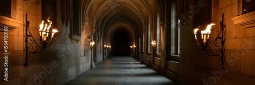 © StudioBackground, Fototapeta premium Dimly Lit Medieval Hallway with Ornate Wall Sconces and Firelight Glow
