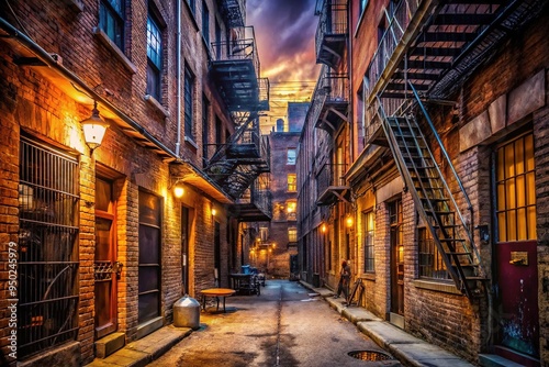 © Adisorn, Fototapeta premium Dimly lit, narrow alleyway in the heart of the city, lined with worn brick buildings, rusty fire escapes, and vibrant graffiti-covered walls.