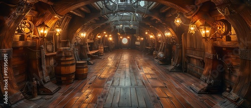 Naklejka premium Dimly lit pirate ships lower deck, detailed wooden interiors with lanterns...