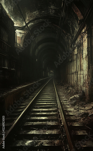 Naklejka premium Dimly Lit Railway Tunnel with Vanishing Tracks