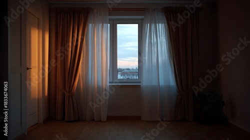 © Thares2020, Obraz premium Dimly lit room interior with curtains drawn showcasing a twilight sky view and warm light from the side