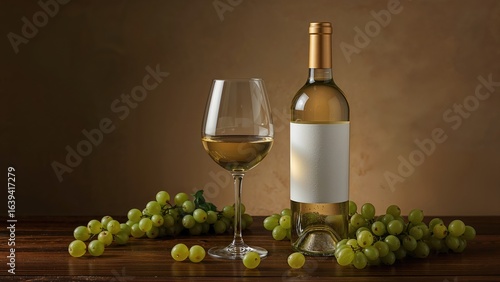 © pngking, Fototapeta premium Dimly lit scene of a white wine bottle and glass with blank label against grapes