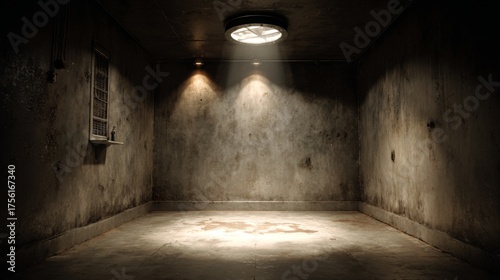 © Ilmi, Fototapeta premium Dimly Lit Solitary Confinement Room with Scratched Walls and a Spotlight Above Casting Dramatic Shadows on the Floor