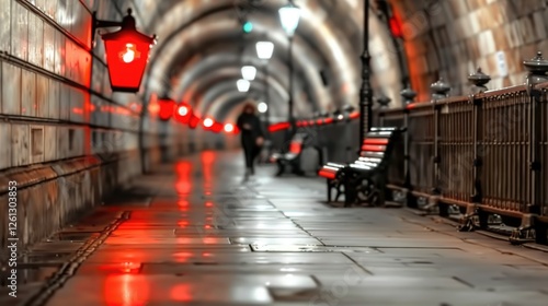 © Konstiantyn Zap, Fototapeta premium Dimly lit underground tunnel with red lanterns and benches at night