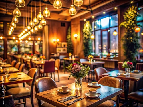 Obraz premium Dimly lit warm tones of an elegant eatery with blurred tables, chairs, and...