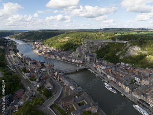 © Sepia100, Fototapeta premium Dinant, Wallonia, Belgium, small city scape river Meuse, aerial drone view.