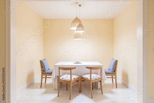 © CoveRipple, Fototapeta premium Dining area wooden floor beige walls table chairs lights