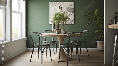 © Aeman, Fototapeta premium Dining nook with driftwood gray table and hunter green metal cafe chairs.