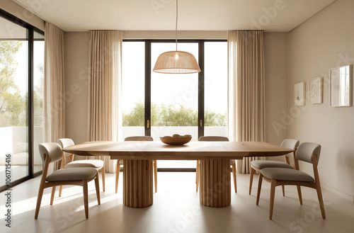 Fototapeta premium Dining room interior with natural wooden table in trendy minimal japandi style