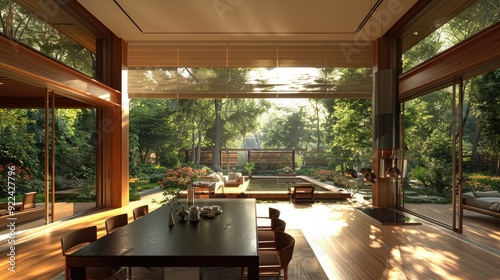 Fototapeta premium dining room with black table and brown chairs, 3d render