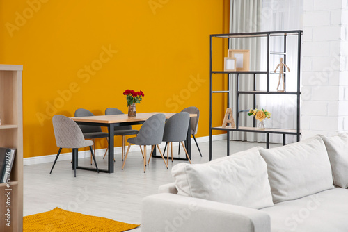 Fototapeta premium Dining table and chairs near orange wall in room. Interior design