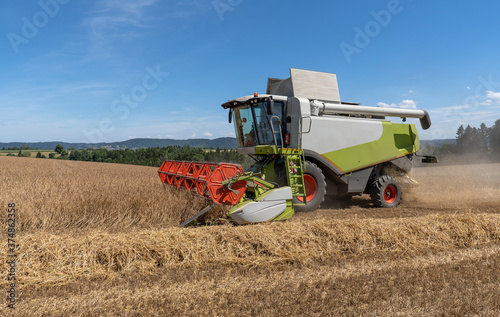 © Robert Schneider, Obraz premium Dinkel Getreidefeld wird von einem Mähdrescher bei blauem Himmel geerntet