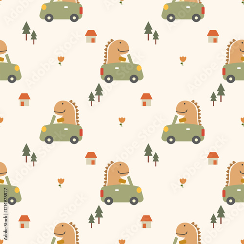 © Therdsak, Obraz premium Dinosaur drive car cartoon so cute. On house tree flower background. Pattern seamless vector illustration.