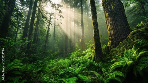 Fototapeta premium Dinosaur-era forest wallpaper with lush ferns and moss-covered trees under...