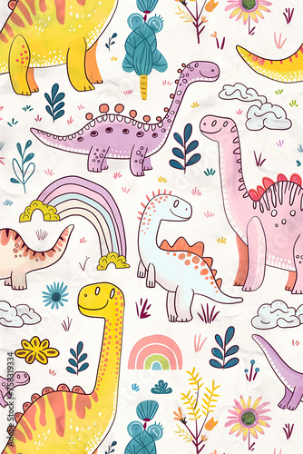 © mattegg, Naklejka premium Dinosaurs and Flowers Pattern on White Background
