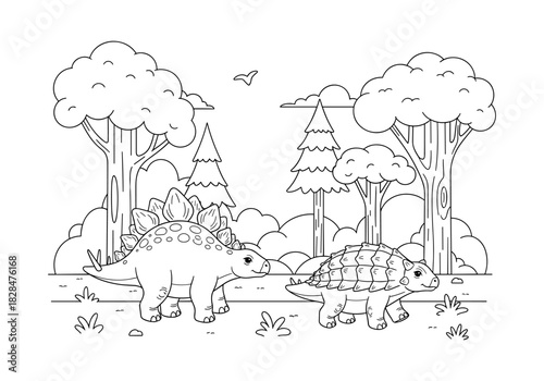 Fototapeta premium Dinosaurs in forest landscape with stegosaurus and ankylosaurus line art