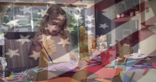 © vectorfusionart, Naklejka premium Dipping paintbrush and applying color, girl painting paper at home craft table, with paint palette