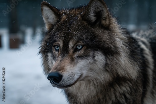 © BISO, Obraz premium dire wolf captured in snowy day portrait image