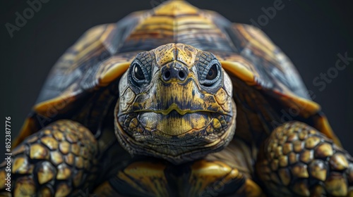 © Johannes, Naklejka premium Direct frontal view of a tortoise with detailed shell patterns and focused eyes. hyper realistic