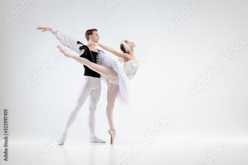 © master1305, Fototapeta premium Direction. Graceful classic ballet dancers dancing isolated on white studio background. Couple in white clothes like a white swan characters. The grace, artist, movement, action and motion concept.