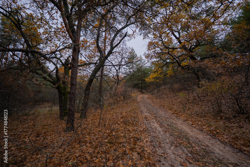 © Maryna, Obraz premium dirt forest road in the dense thicket of an autumn forest