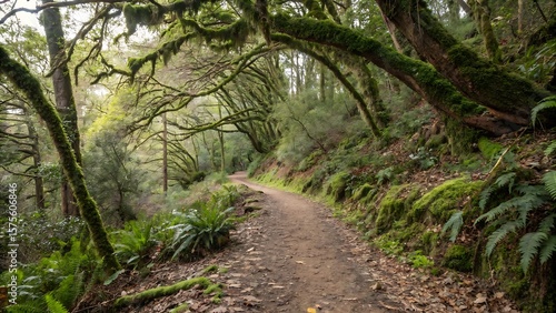 © Baloch, Fototapeta premium Dirt forest trail is winding through flat design woodland, with vines, moss, ferns,
