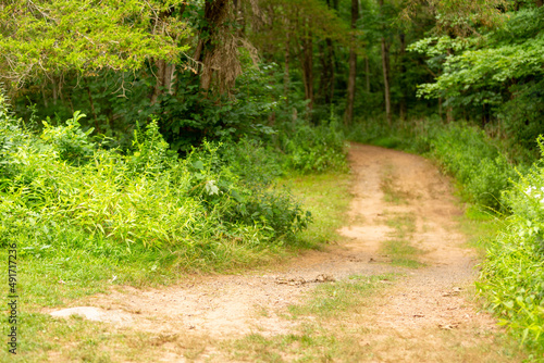 Fototapeta premium Dirt path curving into grassy woods