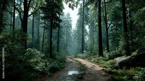 © zacty6, Obraz premium Dirt Path Through Dense Forest with Tall Trees