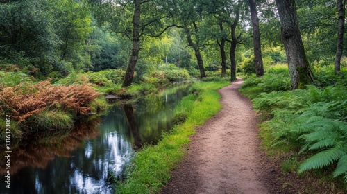 © atipong, Obraz premium Dirt Path Through Fern Forest by Stream