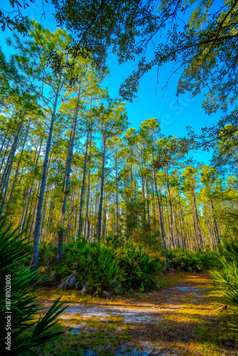 Obraz premium Dirt Path Through Pine Forest Under Bright Blue Sky