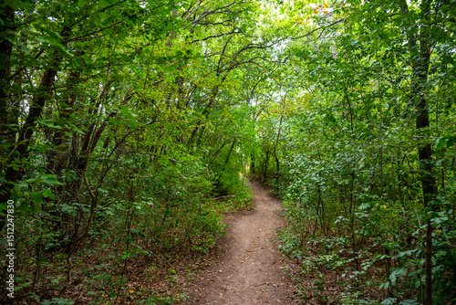 Fototapeta premium Dirt Path Winding Through Dense Green Deciduous Forest on a Summer Day Near...