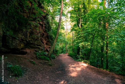 Fototapeta premium Dirt path winds through a dense forest with tall, lush green trees