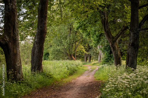 Fototapeta premium dirt path winds through an old park on a summer evening.