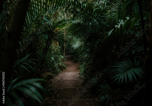 Fototapeta premium Dirt path with steps disappearing into the deep tropical rainforest, surrounded by lush green foliage