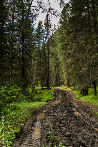 Fototapeta premium Dirt road after rain in evergreen forest near altai mountains