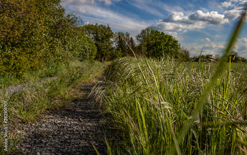 © Manuel Schmid Foto, Fototapeta premium Dirt road beside green spring meadow and cloudy sky