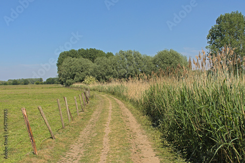 © Kristof Lauwers, Fototapeta premium Dirt road between a meadow and corn field in the Flemish countryside