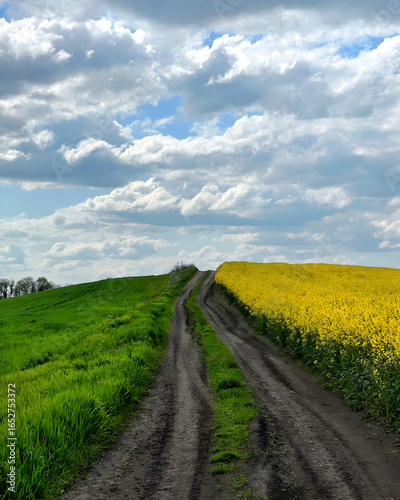 Obraz premium Dirt Road Between Green and Yellow Fields
