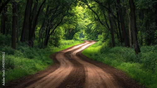 Fototapeta premium Dirt road curves through a lush green forest with trees arching overhead. Perfect for illustrating journeys, nature escapes, or finding your own path.